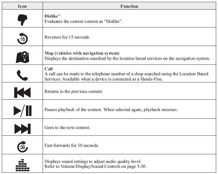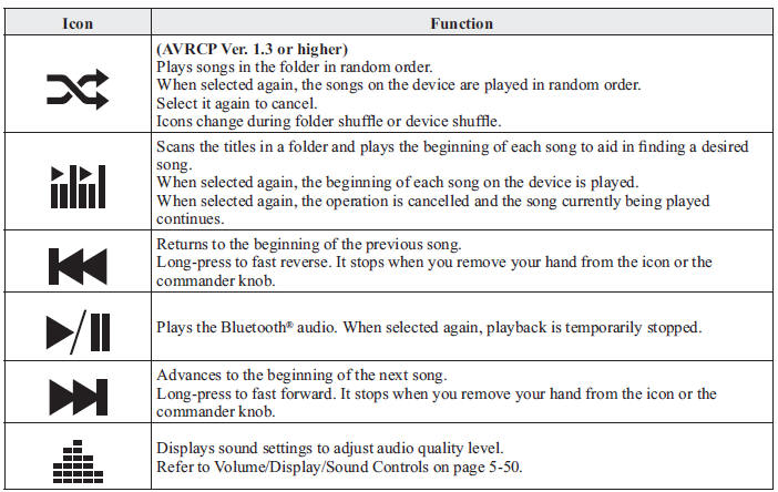 To listen to a Bluetooth ® audio device over the vehicle's speaker system, switch the mode to Bluetooth® audio mode. (Refer to “Switching to Bluetooth ® audio mode”) After switching to the Bluetooth ® audio mode, the following icons are displayed in the lower part of the display. Icons which can be used differ depending on the version of the Bluetooth® audio device which you are currently using.