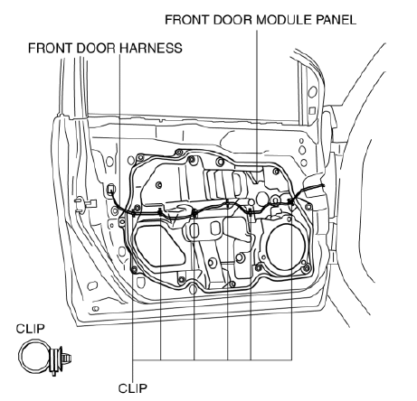 4. Remove the clips securing the front door wiring harness from the front door module panel.
