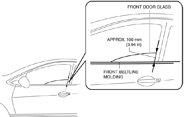 1. To access the glass installation bolt, position the front door glass so that the distance from the top of the front door glass to the upper part of the front beltline molding is approx. 100 mm {3.94 in}.